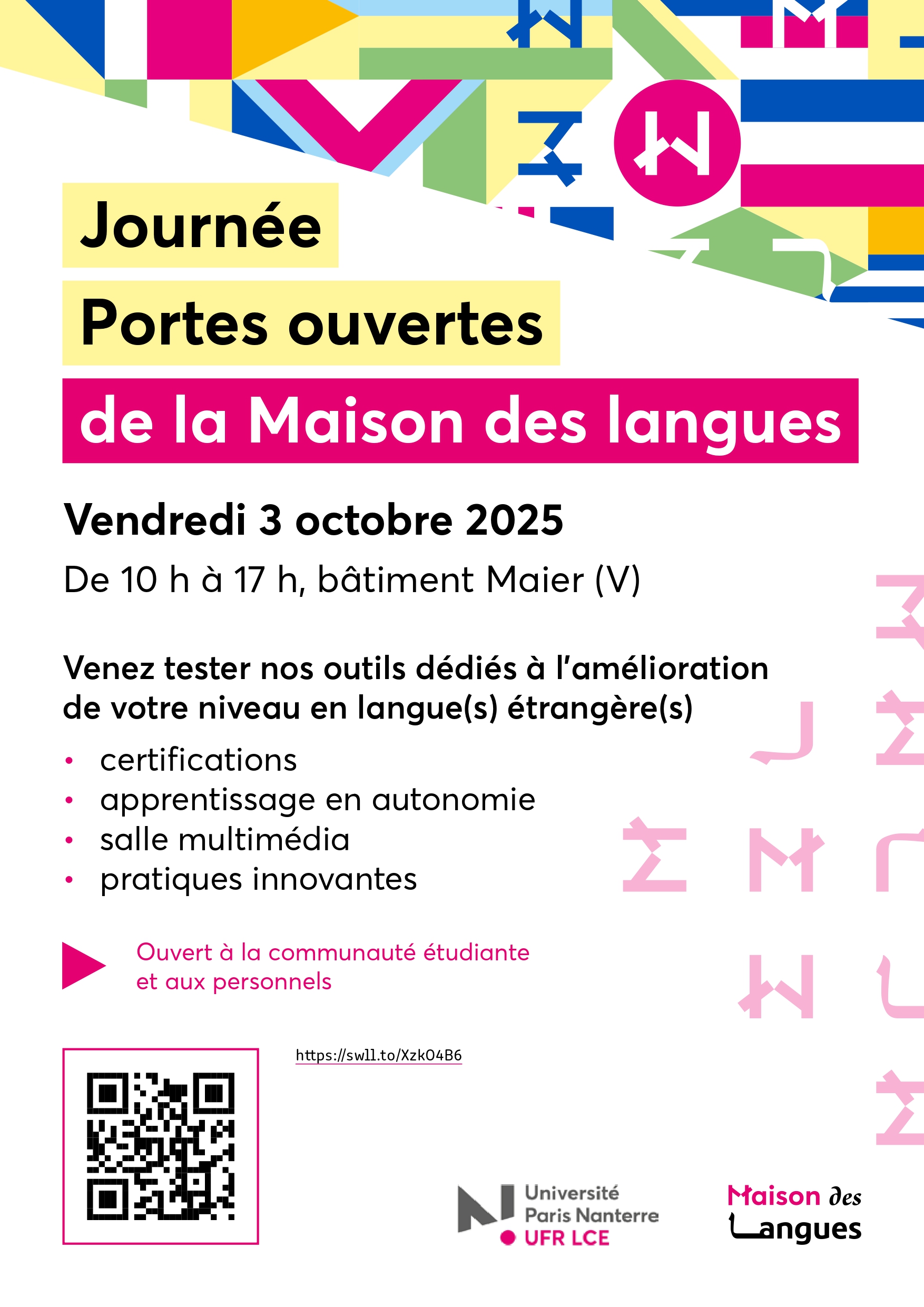 Nous vous invitons à la Journée Portes Ouvertes de la Maison des Langues le vendredi 3 octobre 2025 de 10h à 17h dans l’Espace Odyssée (salle R02, bâtiment Ida Maier).