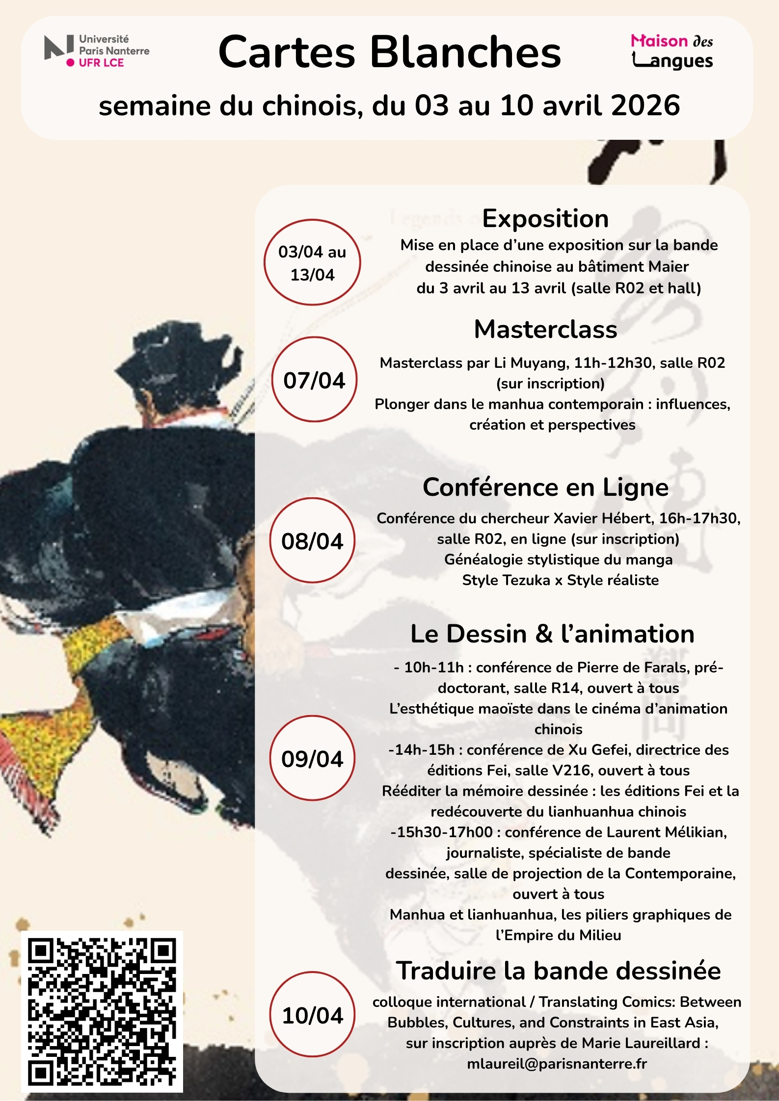 Les Cartes Blanches continuent ! Cette semaine, c'est le département de langue chinoise qui est à l'honneur du 03 au 10 avril 2026. Durant la semaine, différents événements seront organisés autour de la langue chinoise. Retrouvez le programme complet de la semaine ci-dessous :